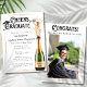 Ankündigung der Grad Art Deco Retro Foto Graduation Party - Eine Retro-moderne und einzigartige personalisierte Graduation Party laden zur Ankündigung ein. Freuen Sie sich auf eine köstliche Champagnerflasche und Deko-Schriftart und Rahmen. Bearbeiten Sie diese Einladungs-Vorlage für Uni- oder Universitäts-Abschluss mit Ihren eigenen Veranstaltungsdetails. Sich noch weiter anpassen, indem ein Abschluss auf der Rückseite eingefügt wird. Auch als sofortiger digitaler Download verfügbar, ideal für den Versand per Text, E-Mail oder Social Media.