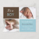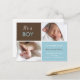 Baby Boy Ankündigung mit einem schicken Farbblock-Design in blau und braun. Laden Sie Ihre Fotos in den dafür vorgesehenen Bereich hoch und geben Sie die Daten Ihres Babys ein.