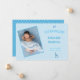 Boys Blue Foto Neugeborene Baby Announcement Card. Das Kartendesign hat ein Foto, das Sie durch Ihr eigenes ersetzen, plus niedlich eine niedliche Giraffe, den Namen des Babys, das Geburtsdatum und lebenswichtige Statistiken. Der Hintergrund ist blau mit weißen Punkten.