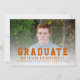 Ankündigung eines Abschlusses mit einem benutzerdefinierten horizontalen Foto. Das Wort "Graduate" erscheint in fett gebrannter orangefarbener Typografie mit einem sportlichen Aussehen, ideal für den Studentenathlet, mit dem Namen, der Schule und dem Jahr des Abschlusses unten in Sans Serif Schriftart. Ersetzen Sie das Beispielbild einfach durch ein Foto Ihres Absolventen. Auf der Rückseite ist eine feste, verbrannte Orange zu sehen. Eine gute Wahl für High School oder Uni-Abschluß.