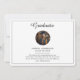 Diese elegante Abschluss-Ankündigungskarte besticht durch ein modernes minimalistisches Design in Schwarz-Weiß-Farbgebung. Der weiße Hintergrund kontrastiert mit fett schwarzem Text für eine klare Lesbarkeit. Die Vorderseite zeigt Text in einer größeren dekorativen Schrift, mit dem Namen des Absolventen in einem sauberen serifenlosen Schriftart. Ein klassisches Graduierungskappensymbol und ein Lorbeerkranz umrahmen den Namen, das Jahr des Abschlusses ist inbegriffen. Akademische Details werden schön in kleinerem Text präsentiert. Auf der Rückseite ist "Graduate" elegant in schwarz geschrieben, neben einem kreisförmigen Foto des Absolventen. Eine persönliche Nachricht bringt eine warme Touch. Diese Karte ist vollständig anpassbar und erlaubt es Ihnen, den Namen, das Jahr und das Foto zu personalisieren. Das zeitlose Design Anzug sowohl formale als auch lässige Feierlichkeiten, perfekt für Absolventen der High School oder Uni. Pair es mit passenden Dankeschön-Karten oder Fotorahmen für eine zusammenhängende Präsentation.