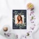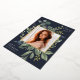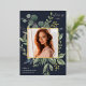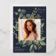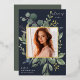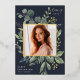 Unsere Eukalyptus & Sage Abschluss Ankündigung bildet ein Foto Ihres Absolventen mit einem eleganten quadratischen Rahmen von üppigen Aquarelleukalyptus und Salbei-grünen Blätter, mit echten Goldfolien-Trimm auf einem dunkelblauen Hintergrund. Personalisieren Sie das Unterrichtsjahr, den Namen und die Schule Ihres Absolventen. Fügen Sie der Rückseite eine persönliche Nachricht und ein zusätzliches Foto hinzu.