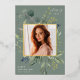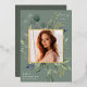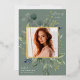 Unsere Eukalyptus & Sage Abschluss Ankündigung bildet ein Foto Ihres Absolventen mit einem eleganten quadratischen Rahmen von üppigen Aquarelleukalyptus und Salbei-grünen Blätter, mit echten Goldfolien-Trim auf einem Ton auf dem grünen Hintergrund. Personalisieren Sie das Unterrichtsjahr, den Namen und die Schule Ihres Absolventen. Fügen Sie der Rückseite eine persönliche Nachricht und ein zusätzliches Foto hinzu.