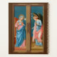 " ℣. Der Engel des Herrn verkündete Maria, ℟. Und sie dachte sich den Heiligen Geist aus." So beginnt der Angelus das dreitägige Gebet der Kirche an die gesegnete Jungfrau Mary (BVM), die an die Inkarnation bei der Verkündigung erinnert. + Die Ankündigung war ein sehr beliebtes Thema in der Kunst des Mittelalters und der Renaissance. Als Zwei-Personen-Komposition lieh sich das Subjekt an den äußeren Blätter des Triptychons: der Engel auf dem einen Blatt; Maria auf dem anderen. Ein Triptychon ist ein Kunstwerk - meistens ein Panelgemälde - das aus drei Teilen besteht, die so zusammengeschoben werden, dass es offen oder gefaltet geschlossen dargestellt werden kann. + Hier, Filippo Lippi (1406-1469) hat die Verkündigung in Tempera auf Holz in warmen Rosa, Salmonen, Rot und in brillanter und dunkler Blues gemalt. Beide Figuren stehen in ihren engen jeweiligen Räumen, der Erzengel Gabriel beugt sich leicht der sanften und süßen Maiden Mary. + Saints_Alots mag einen dunkelbraunen Hintergrund für dieses Bild. Ein dunkelbrauner Hintergrund vermittelt dem Betrachter den Eindruck, dass er die Szene durch ein Fenster beobachten kann. Aber wie üblich haben wir auch eine Farbpalettenpostkarte für andere empfohlene Farbtöne zur Verfügung gestellt. + Feier der Verkündung: März 25; Fest des hl. Gabriel der Erzengel: 29. September + Bildkredit (M 038): Antiquitätenbild der Ankündigung von Filippo Lippi (1406-1469) aus einer Postkarte aus dem späten 19. bis frühen 20. Jahrhundert Die von E. Sborgi, Florenz, Italien, erschienene Schrift stammt aus der privaten Sammlung religiöser Ephemerien des Designers. Die Originalpaneele aus einem Polyptychon unbekannten Ursprungs befinden sich im Filippo- und philippinischen Saal der Uffizi Galerie in Florenz. Die Annunziation bildet die obere Hälfte der beiden Blätter während SS. Anthony Abbott und John the Baptist erscheinen auf der unteren links bzw. unteren rechten.