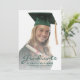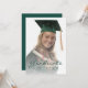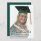 Moderne Abschluss-Ankündigung mit einem individuellen vertikalen Foto. Das Wort "Graduate" erscheint in dunkelgrüner Schrift, mit dem Namen des Absolventen, Schule und Jahr des Abschlusses unten in Sans Serif Schriftart. Ersetzen Sie das Beispielbild einfach durch das Foto Ihres eigenen Absolventen. Ein Bildschirm mit weißem Farbverlauf trägt dazu bei, die Pop des Textes zu gewährleisten. Die Rückseite ist massiv dunkelgrün. Ideal für High School oder Uni-Abschluss.