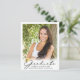 Mit dieser preisgünstigen Ankündigung auf 4,5 x 5,6 cm leichtem Papier statt Karton, mit 5 Fotos (1 vorne und 4 hinten) und einem modernen, handgeschriebenen Schriftzeichen typografie GRADUATE Titeldesign in Schwarz mit einem Imitat Metallic Goldfolie Graduierdeckel oder Mortarboard Akzent. Der Rücken ist so konzipiert, dass er Informationen über die Leistungen, Aktivitäten und Zukunftspläne Ihres Absolventen auf Wunsch enthält. Ideal für konservative Budgets und/oder Handarbeit. HILFE: Bitte kontaktieren Sie den Designer, um Hilfe bei der Modifizierung oder Personalisierung des Designs, der Farbänderung oder der Übertragung des Designs auf ein anderes Produkt zu erhalten, BEVOR er die Bestellung über die Registerkarte Zazzle Chat MESSAGE oder per E-Mail makeitaboutyoustore@gmail.com.