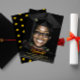 Feiern Sie die Vollendung eines Lebens mit diesen Ankündigungen mit Ihrem Foto- und Goldtext auf der Vorderseite und den Gold Graduierungskappen auf der Rückseite. Viel Platz, um alle Details in anpassbaren Textfeldern hinzuzufügen.