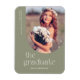 Dieser moderne Abschluss-Ankündigungsmagnet zeichnet sich durch elegante Typografie und ein Off-Center-Foto aus. Der Satz "Der Absolvent" ist in einem einfachen und trendigen Schriftart unter dem Foto geschrieben. Der Name des Absolventen wird unter der Typografie zentriert, während die Schule und das Abschluss des Absolventen vertikal entlang der links Seite des Fotos geschrieben werden. Die Typografie ist hellcreme vor einem schluckgrünen Hintergrund.