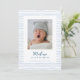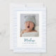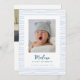 Die klassische Hand gezeichnet Blauer Streifen Geburtshinweis präsentiert einen gepflegten Augenblick in klassischem Stil. Mit dieser Geburtsankündigung erobern Sie das eigentliche Wesen der freudigen Reise in das Elternhaus. Mit einer Touch der Nostalgie und einem Hauch modernen Charmes gestaltet, ist diese Ankündigung der ideale Weg, um der Welt Ihr kleines Freudenbündel näher zu bringen. Das Foto des wertvollen Neugeborenen liegt in einer biologisch von Hand gezeichnet, blau gestreiften Bühne, umgeben von der Wärme der Tradition und dem Versprechen neuer Anfänge. Die sanften Farbtöne der blauen Streifen strahlen ein Gefühl von Ruhe und Wachstum aus und symbolisieren das frische Kapitel in der Geschichte Ihrer Familie. Jedes Detail ist auf Perfektion ausgelegt - von den künstlerischen, unvollkommenen Linien der Streifen, die ein authentisches Gefühl ausstrahlen, bis zu den hochwertigen Papier, das eine Touch der Eleganz verleiht. Das klassische Design ist ein Hinweis auf die zeitlose Natur von Liebe und Familie, um sicherzustellen, dass diese Ankündigung nicht nur von Ihnen geschätzt wird, sondern auch von denen, die glücklich genug sind, sie zu empfangen. Ob Sie die Neuigkeiten mit nahen Familienmitgliedern und Freunden teilen oder eine Ankündigung an einen größeren Kreis machen, diese Geburtsankündigung verbindet Tradition und zeitgenössische Ästhetik mühelos. Es ist nicht nur ein Stück Papier, es ist ein Herzstück, ein Sinnbild der Liebe, die mit der Ankunft Ihres Kleinen blüht. Feiern Sie das Wunder des Lebens, verkünden Sie die Ankunft Ihres Babys und verbreiten Sie das Glück mit dieser klassischen Geburtsankündigung. Ein wahrer Sake, der das Wesen eines Augenblicks erfasst, für immer gerahmt in handgezeichnet blauen Streifen - ein Rahmen, der die grenzenlose Liebe und Freude, die Ihre neue Reise in sich birgt, darstellt. Geben Sie auf der Kartenrückseite ein zusätzliches Foto und Details zur Ankunft Ihres neuen Zimmers ein.