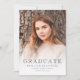 Dieses Foto Abschluss-Ankündigung enthält Foto des Absolventen mit einem marineblau blauen Texteüberlagerungen. Das Wort "Absolvent" erscheint in dekorativer Kontur Typografie. Geben Sie den Namen, die Schule und das Unterrichtsjahr des Absolventen unten ein. Auf der Rückseite befindet sich ein elegantes, Vintages Wappen, das ein weißes Monogramm auf marineblarem Hintergrund umgibt, sowie ein Textraum, in dem die Leistungen und Pläne des Absolventen aufgezeigt werden.