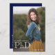 Eine PhD-Abschluss-Ankündigung für Fotos, die Ihren Namen, Ihr Klassenjahr, eine anpassbare Nachricht und vieles mehr enthält. Die Vorderseite der Ankündigung zeigt ein vertikales Foto. Die andere Seite hat einen blauen Hintergrund mit weißem Text. Tauschen Sie einfach das Foto aus, passen Sie die Wörter an, fügen Sie die Ankündigung in Ihren Warenkorb, und lass jedem wissen, dass Sie etwas Großes erreicht haben. Minimalistisches Foto PhD Abschluss Announcement Class of 2023 Holidayday Design | ©Melissa Patton - Designer<i>Fotografie © Storytree Studios, Stanford, CA</i>