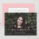 Diese vollständige Ankündigung von Foto Abschluss enthält das Wort "graduate" in rosa Schrift auf der anderen Seite geschrieben. Es hat Platz für den Namen des Absolventen, das Klassenzjahr und die Schule. Die Rückseite der Karte kann für eine persönliche Nachricht oder für die Einladungsdetails der Graduiertenparty verwendet werden.