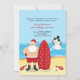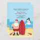 Eine niedliche Weihnachtsankündigung für diejenigen, die in ein warmes Klima ziehen. Die Karte zeigt Santa am Strand mit seinem Surfbrett und einem Schneemann, der im warmen Ozean schmilzt.