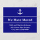 Diese weiße und marineblau bewegende Ankündigung hat oben einen weißen Schiffsanker. In der Mitte gibt es einen anpassbaren Text, der derzeit "Wir sind umgezogen" lautet. Sie können Ihre bewegte Ankündigung mit Ihrem Namen und Ihrer neuen Adresse in weißem Text personalisieren.