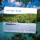 Postanschrift auf dem See, bewegte Postkarten mit eigenem Text. Fotografie von Kindern, die auf einem schwimmenden See Floß spielen und grüne Hügel entlang der Küste, ist auf der Vorderseite mit Text Ihrer Wahl. Stellen Sie auch Text auf der Rückseite mit neuen Adressinformationen ein. Ideal für die Glücklichen, die am See leben.