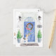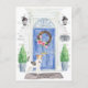 Mit unserer stilvollen Ankündigung kündigen Sie Ihre neue Adresse an: ein Wire Hair Fox Terrier, blaue Eingangstür, Begrüßungstür, Schiefer-Schild, Topiaries und ein blumengeschmücktes Set auf grauem Backstein.