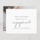 Budget Minimalistisches Skript Foto Verlobung Ankündigung. Ein Preis SMALLER 4,5" x 5,6" Alternative. Erhältlich in einem SEMI-GLOSS 110 lb CARD STOCK, der die Standardoption (dicker für Einladungen) ist, ODER einem SATIN FINISH 80 lb THINNER PAPER STOCK (ideal für Gehäuse). Ein minimalistisches typografisches Design, um jedem lassen, Ihre aufregende Neuigkeit, Verlobung ist in einem modernen Set-Skript.Die Erholung des Textes können Sie leicht personalisieren. Ersetzen Sie das Beispiel-Foto auf der Rückseite durch das eigene. Text- und Hintergrundfarben können geändert werden, wenn Sie über die Option Weitere Einstellungen wünschen.