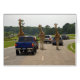 Ein sonniges Foto mit drei Giraffen, die mitten auf der Straße spazieren.