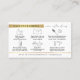 Stellen Sie sicher, dass Ihre Kunden wissen, wie sie sich um ihre Schuss- oder Banderweiterungen kümmern, mit einer benutzerdefinierten Haarverlängerung nach der Pflege Anweisungen Visitenkarte. Diese gläserne, weiße und goldene Friseursalon-Pflegekarte beinhaltet Icons und Pflegetipps für Haarverlängerungen (kann für Naturhaare oder Imitate verwendet werden), moderne Goldeffekt-Schriftart und Platz für Ihre Geschäftsdetails. Dieses elegante Imitat mit goldenen Haarverlängerungen ist die perfekte Ergänzung zu Ihrem Friseursalon oder Schreibwaren-Design.