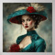 Anna ist eine echte, schöne Art-Déco-Frau. Sie ist in einem hübschen Vintagen Kleid gekleidet, mit einem passenden Hut mit Federn und einer Blume. Ein schönes Portrait, das ein Beispiel einer Frau in einer vergangenen Zeit zeigt. Schöne Farbkombination von Türkis und Creme mit einer Touch Rot.