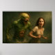A woman with a terrified expression runs through a swamp while being pursued by a menacing green monster with sharp teeth and vine-like appendages. The scene conveys a sense of danger and urgency, set in an eerie, mist-filled environment.