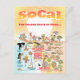 Farbenfrohe Aussicht auf Südkalifornien - abscheuliche Figuren, die am Strand und in der Wüste von SoCal ausgestellt sind, in denen Los Angeles, Orange Landkreis, Santa Barbara, San Diego, Riverside, Palm Springs, Anza Borrego und Joshua Tree Parks zu sehen sind - auch die Grenzstädte Tijuana, Tecate und Mexicali. Diese SoCal-Karte hat alles - ein Surfer hängt zehn, ein Killerwal springt aus dem Wasser, Zootiere grüßen die Touristen, ein Strandpaar spielen im Surf als ein T-Rex eine Herausforderung brüllt und ein Panzer in Position und vieles mehr...