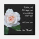 Ein hübscher "Save the Date" Kühlschrankmagnet für Sie, mit einem blassrosa Rosenbud, "New Dawn", auf schwarzem Hintergrund, von einem Foto von Judy Adamson