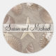 Schöne Hochzeitsaufkleber zum Thema Strand mit Seestern in der Mitte. Eine weiße Linie hält die Namen von Braut und Bräutigam. Der Hintergrund ist eine natürliche Sandfarbe mit vielen Muscheln. Schokoladenbraun. Vergnügliche tropische Aufkleber können sofort personalisiert werden.