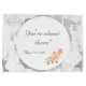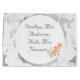 Das Design bietet ein Hintergrundbild von weißer, zarter Spitze. Das Zentrum ist weiß mit anpassbarem Text in einem silberfarbenen Nuptial Schriftart. Im vorderen Text steht: "Auf Wiedersehen, Miss Anderson; Hallo, Mrs. Flemming!" Reverse lautet: "Du bist fast da!" plus das Datum der Hochzeit. Das Bild von Rose mit weichem Pfirsichfarben zeichnet den unteren Rand. Ideal für ein Brautparty.