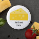 Fügen Sie einen Slogan oder Namen hinzu, um ein personalisiertes Geschenk mit einem Käsethema zu erstellen. Das Bild zeigt einen großen Keil von Schweizer Käse mit Löchern.