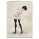 Diese Abbildung zeigt eine Frau mit einem rosa Korsett, das sich über die Garniere auf ihren schwarzen Strümpfen anlehnt, während sie sich anzieht.