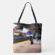 Rufen Sie alle Bahnfreunde an! Das Originalfoto von ZoeSPEAK auf diesem Tote Bag zeigt einen glänzenden blauen Motor, der einen Zug auf Track 2 in den Bahnhof zieht. Das rote Ziegeldach der gegenüberliegenden Plattform und eine Palme sind im hellen tropischen Licht zu sehen.