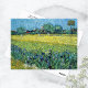 Eine Postkarte mit dem Gemälde View of Arles with Irises (1888) des holländischen Künstlers Vincent van Gogh (1853-1890) Eine schöne Landschaft mit Weizenfeldern neben einer Wiese und einer Reihe von Iris-Blume im Vordergrund.