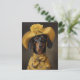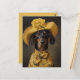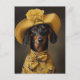 Elegante schicke Dackel im Stil des niederländischen Malers Frans Hals. Niedlicher Hund mit gelbem Kleid und Hut mit gelben Blumen