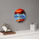 Anstrich von Wellen, die am Ufer mit einem roten und orangefarbenen Sonnenuntergang abstürzen.
