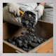 Eine hochqualitative Grafik des Prozesses der Entladung einer Tüte Anthrazitkohle in einen Holzbehälter. Das Design ist perfekt für diejenigen, die die harte, schmutzige Arbeit verstehen.