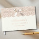 Personalisieren Sie dieses elegante Spitze-Hochzeitsgästebuch, inspiriert von der Regency-Ära, mit einem charmanten Bridgerton-Thema. Dieses elegante Erinnerungsstück zeigt beige Spitze, verziert mit zarten rosa-beigen Perlen, vor einem vintage-elfenbeinfarbenen Hintergrund. Ein wunderschönes Satinband in staubigem Rosa fügt einen Hauch von Eleganz hinzu und unterstreicht den vintage, femininen Charme. Perfekt für das Festhalten herzlicher Nachrichten, ist dieses Hochzeitsgästebuch mit einer schönen Foil-Schrift-Kalligrafie-Schriftart eine exquisite Ergänzung für jede anspruchsvolle Hochzeitsfeier. Eine zeitlose Mischung aus Eleganz und Charme, macht es ein unvergessliches Erinnerungsstück für jede Braut, die den romantischen Geist einer vergangenen Ära verkörpert.
