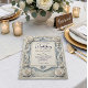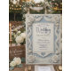 Erheben Sie Ihre Hochzeit mit diesem falschen 3D-Rosenrelief-Design, das neoklassizistische Schieferblautöne und eine romantische Landschaftsillustration einer Kirche im Erbstil zeigt. Diese Komposition zeigt formale neoklassizistische Designprinzipien, zentriert um einen herzförmigen Ausschnitt, der einen gewundenen Weg zu einer traditionellen Kirche zeigt. Der visuelle Mittelpunkt ist ein dimensionaler Rahmen aus falsch geschnitzten Rosen und Rosenknospen, der die Textur von antiker Stuckarbeit oder geschnitztem Stein nachahmt. Die Farbgeschichte verwendet eine anspruchsvolle Palette aus cremigem Off-Weiß und staubigem Schieferblau, wobei marineblaue Akzente einen tiefen Kontrast bieten. Die Typografie ist mit einer schwungvollen dekorativen Schrift für Namen und einer strukturierten, lesbaren Serifen-Schrift für Ereignisdetails ausgewogen, um eine Hierarchie zu gewährleisten