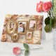 Vintage-Rosenrahmen mit sanftem goldenen Blumenschimmer präsentieren eine zarte visuelle Geschichte, die um verzierte goldene Rahmen, geschichtete rosa und elfenbeinfarbene Rosen und einen sanft leuchtenden floralen Hintergrund herum aufgebaut ist. Diese Grußkarte bringt antikinspirierte ovale und rechteckige Rahmen, warme Champagner-Höhepunkte und malerische Blütenblätter in einer harmonischen Collage zusammen, die zeitlos und herzlich wirkt. Für ein gefaltetes Grußkartenformat auf Zazzle konzipiert, bietet sie Platz für fünf anpassbare Fotos und eine persönliche Nachricht, die nahtlos in die gerahmte Komposition integriert sind, ohne die umgebenden Blumen zu überlagern. Sekundäre Schlüsselwörter wie Vintage-Blumencollage und Erbstück-Fotorahmen sind durch scrollende Rahmendetails, blütenblattreiche Ränder und eine gedämpfte Pastellpalette, die Pfirsich, Creme, sanftes Rosa und warme Goldtöne kombiniert, in die Ästhetik eingewoben. Der Gesamtstil evoziert Nostalgie, Intimität und stille Eleganz und ist daher für Feiern, Meilensteine oder bedeutungsvolle persönliche Momente geeignet. Subtile botanische Akzente, geschichtete Tiefe und ausgewogene Symmetrie führen das Auge natürlich von Foto zu Foto, während Platz für Namen oder ein individuelles Gefühl bleibt. Jedes Element – von den antiken Rahmensilhouetten bis zum sanft diffusem Blumenh
