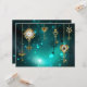Gold, antike Schlüssel mit Gängen und Dials hängen an goldenen Ketten auf leuchtend grünem Hintergrund.