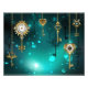 Gold, antike Schlüssel mit Gängen und Dials hängen an goldenen Ketten auf leuchtend grünem Hintergrund.