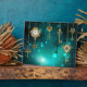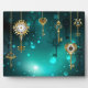 Gold, antike Schlüssel mit Gängen und Dials hängen an goldenen Ketten auf leuchtend grünem Hintergrund.