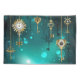 Gold, antike Schlüssel mit Gängen und Dials hängen an goldenen Ketten auf leuchtend grünem Hintergrund.