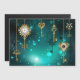 Gold, antike Schlüssel mit Gängen und Dials hängen an goldenen Ketten auf leuchtend grünem Hintergrund.