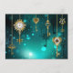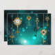 Gold, antike Schlüssel mit Gängen und Dials hängen an goldenen Ketten auf leuchtend grünem Hintergrund.