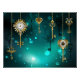 Gold, antike Schlüssel mit Gängen und Dials hängen an goldenen Ketten auf leuchtend grünem Hintergrund.