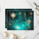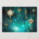 Gold, antike Schlüssel mit Gängen und Dials hängen an goldenen Ketten auf leuchtend grünem Hintergrund.