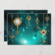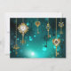 Gold, antike Schlüssel mit Gängen und Dials hängen an goldenen Ketten auf leuchtend grünem Hintergrund.