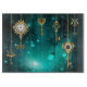 Gold, antike Schlüssel mit Gängen und Dials hängen an goldenen Ketten auf leuchtend grünem Hintergrund.