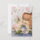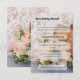 Ein charmantes und nostalgisches Design voller Textur. Diese Einladung zeigt ein wunderschönes Bouquet aus Pfirsich-Nelken, weißen Rosen und blauen Akzentblumen, die auf einem blauen Samtsitz ruhen. Der Hintergrund zeigt einen geflochtenen Rattan-Sessel und eine vintage Blumen-Tapete, die eine schöne "Französische Landhaus"- oder "Shabby Chic"-Ästhetik schafft. Sie ist perfekt für Gartenhochzeiten, Brautduschen oder Frühlingstee-Partys.